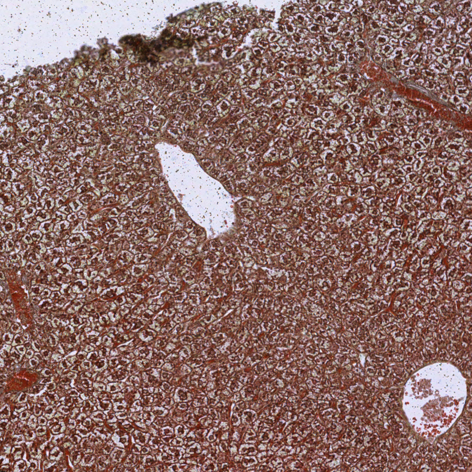 The cellular structures are difficult to interpret, particularly, the sinusoids and the portal triads using the pentachrome stain kit. Additionally, the intensity of the cytoplasm staining red obscures the visibility of the nuclei. The pentachrome stain kit is helpful in visualizing the lipid droplets in the hepatocytes which can be helpful when diagnosing steatosis.