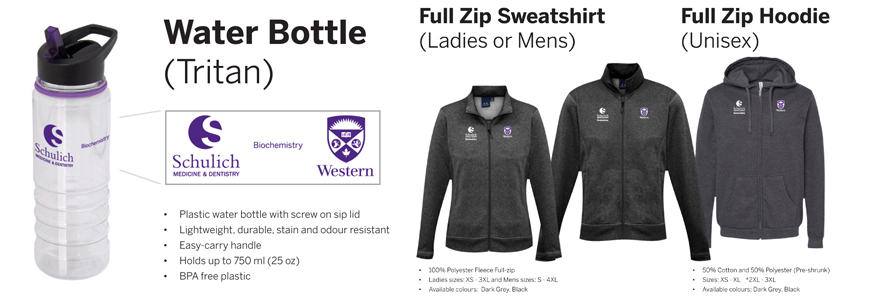The Department of Biochemistry at Western University is selling Biochem merch this year. Samples of the hoodies and sweatshirts will be available to try on in the Biochemistry main office in MSB 342 from Tuesday, October 10 to Thursday, November 9