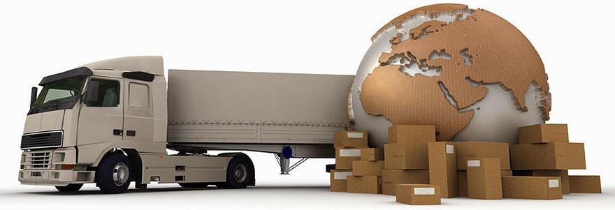 picture of a truck, boxes, and a giant globe of the world