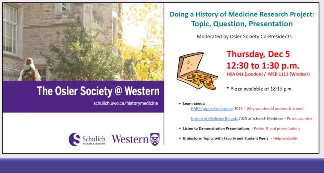 Doing an Independent HoM Research Project: Topic, Question, Presentations Come learn about the HMD Calgary Conference, History of Medicine Rounds at Western, and how to design an abstract and research project. Demonstration presentations from past medical research projects will be offered. |