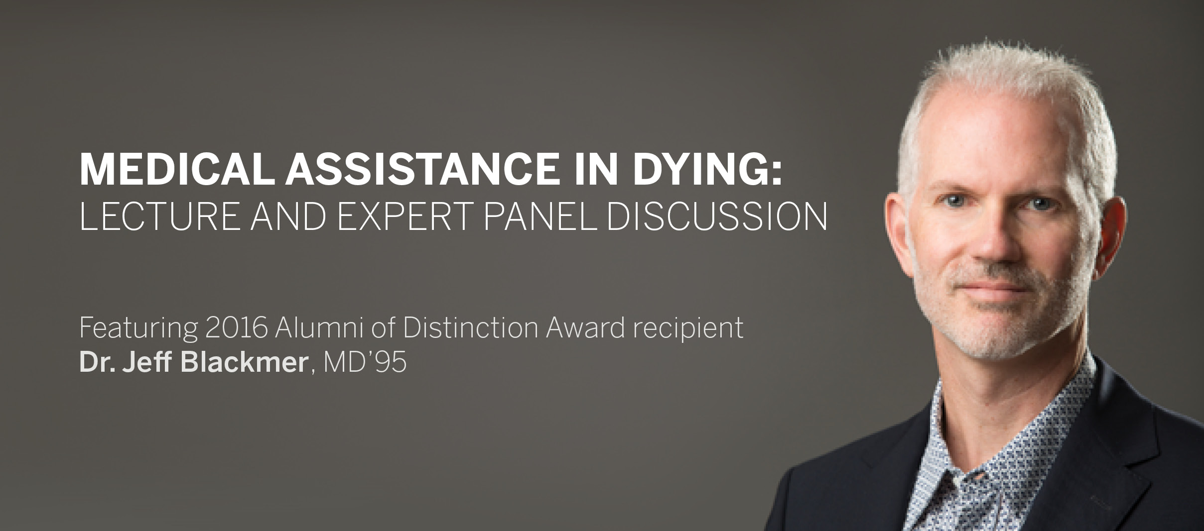 With the controversial assisted-dying Bill C-14 now law, this timely discussion will bring together a cross section of experts from various fields. This two-part event will begin with a lecture from Dr. Jeff Blackmer, MD'95, Vice President, Medical Professionalism, Canadian Medical Association, who is leading the way through the heavily-debated legislation. Following the lecture a panel discussion and audience question and answer period will be moderated by Carly Weeks, MA ’04, Journalist, The Globe and Mail.